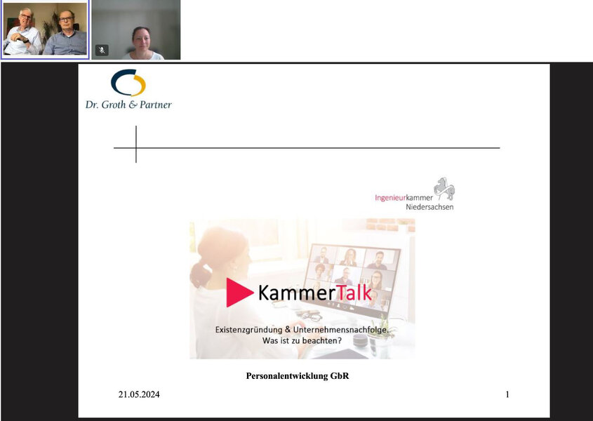 Die Unternehmensgründung bzw. -nachfolge erfolgreich gestalten – vor dieser Herausforderung stehen kleine bis mittelständige Ingenieurbüros. Entsprechend groß war die Resonanz mit über 50 Teilnehmenden beim dritten digitalen KammerTalk. Am 21. Mai 2024 widmete sich die digitale Veranstaltung dem Thema "Existenzgründung & Unternehmensnachfolge. Was ist zu beachten?".