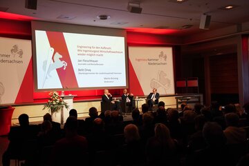 Außerdem zu Gast war der Staatssekretär aus dem Niedersächsischen Wirtschaftsministerium, Matthias Wunderling-Weilbier. Er sprach unter anderem über Investitionsprogramme und sagte zu den anwesenden Ingenieurinnen und Ingenieuren: „Ohne Ihre Expertise, Ihre Kreativität, Ihren Mut, neue Wege zu gehen, bleiben politische Ziele mehr oder weniger abstrakt.“