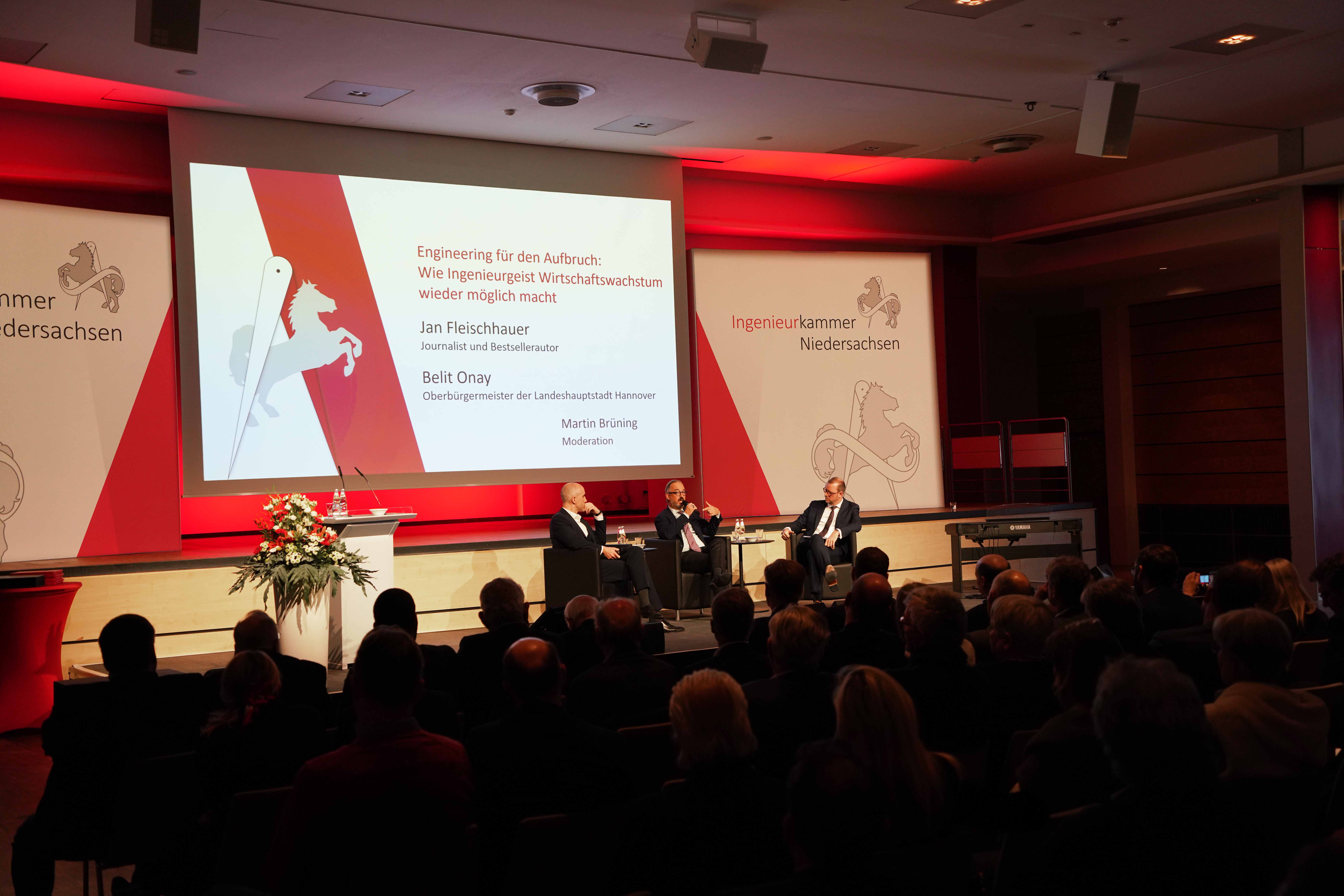 Vor rund 300 Gästen in der Niedersachsenhalle in Hannover diskutierten der Oberbürgermeister der Landeshauptstadt Hannover, Belit Onay, und der Focus-Kolumnist Jan Fleischhauer mit Moderator Martin Brüning unter dem Titel: „Engineering für den Aufbruch: Wie Ingenieurgeist Wirtschaftswachstum wieder möglich macht“. Fleischhauer bezeichnete die Ingenieurinnen und Ingenieure als „Rückgrat“ Deutschlands und wünschte sich mehr von ihnen.